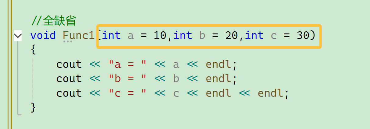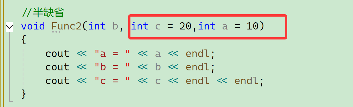 三个都给了缺省值, 全缺省比较灵活,不用考虑跳不跳过的问题,我们可以灵活调配,a、b、c的位置可以随便放,因为这是你定义的函数嘛。这个方法在半缺省很适用。