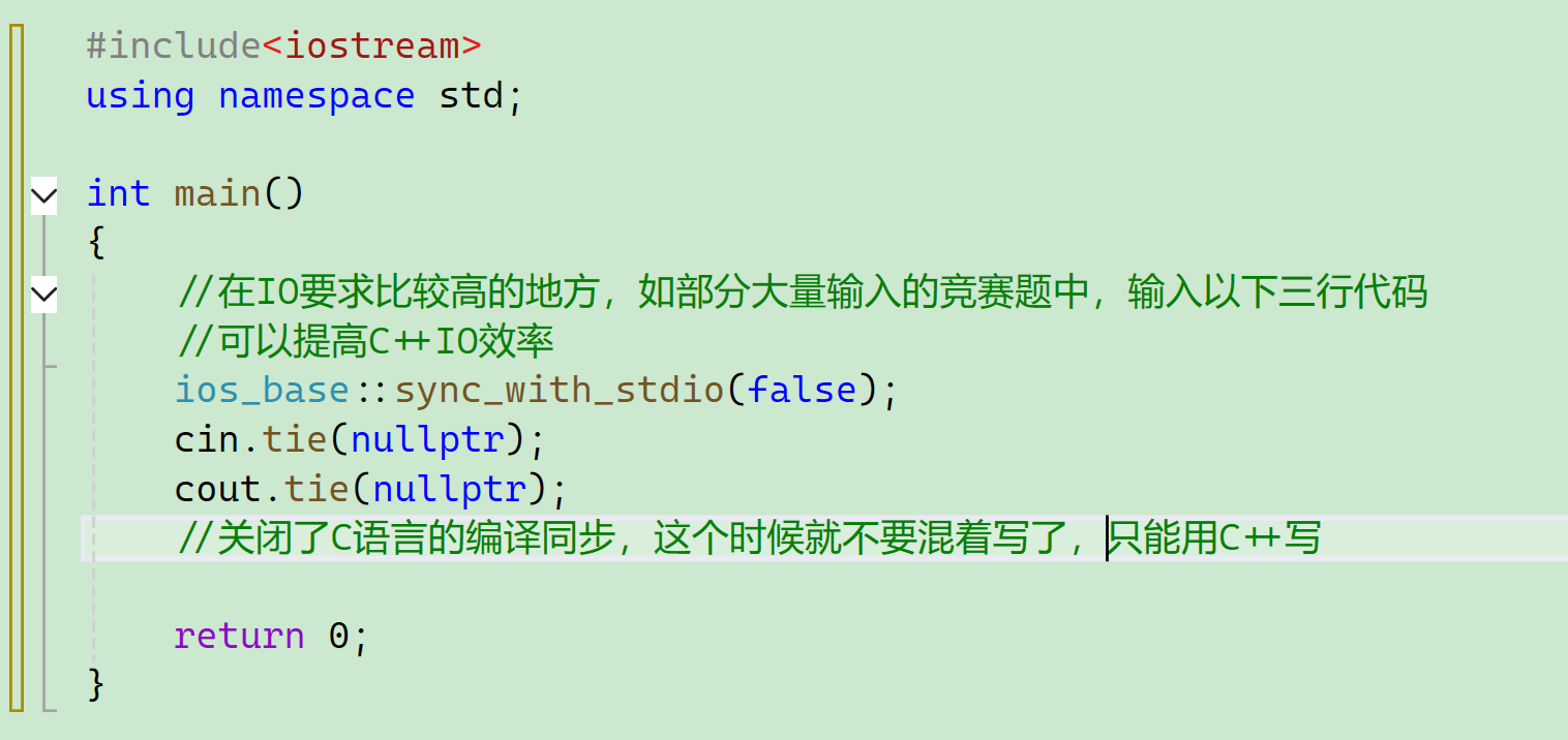 实际上就是关闭了C语言的同步,这个时候就不要混着写了,只能用C++一种语言写。 当然这三行代码还有很多内容我们现在还没有办法用现有的知识很好地解释。 等我们后面学习了IO流,会更细节地进行介绍,一个是ostream另一个是istream嘛。