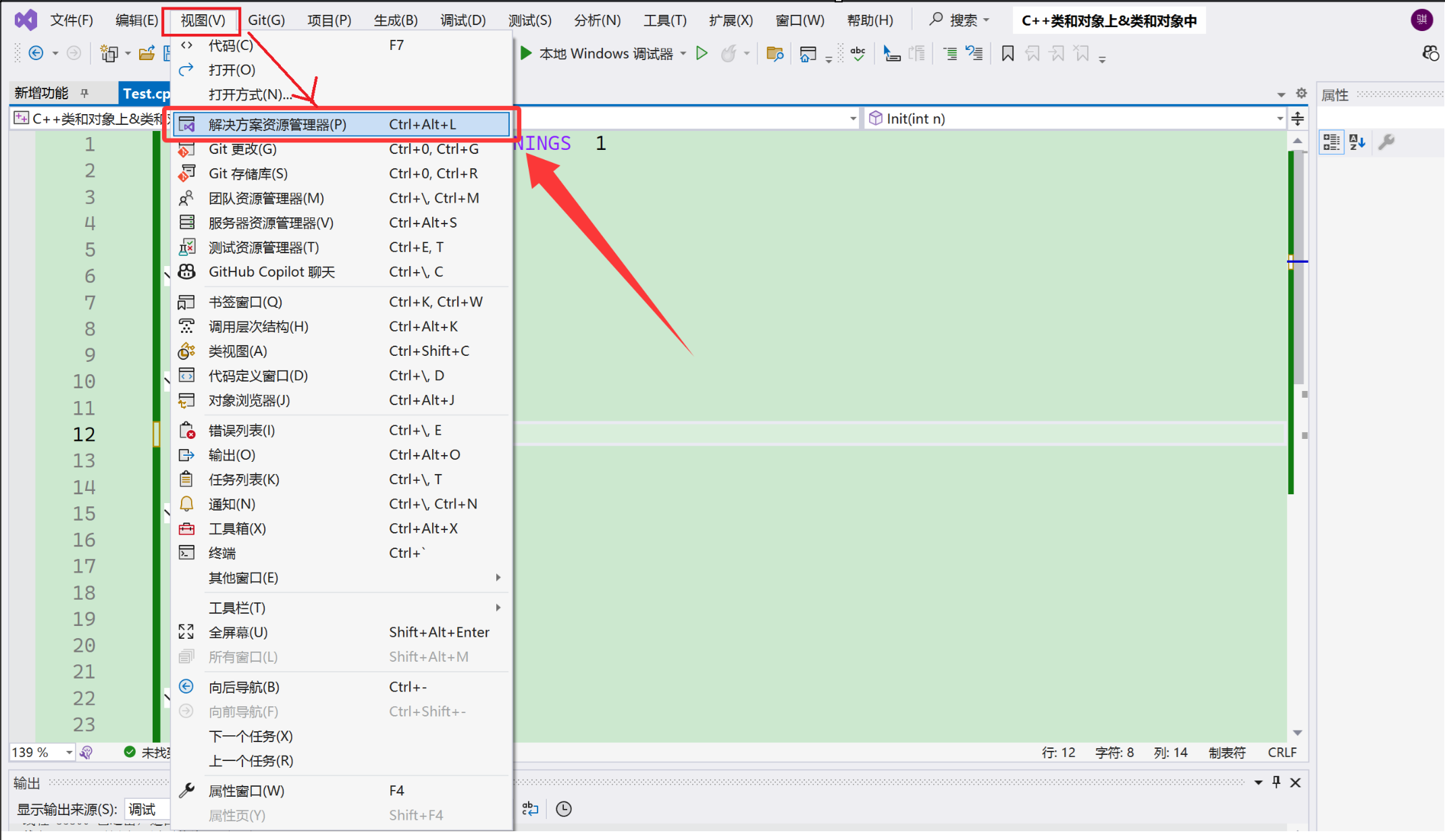 找到【解决方案资源管理器(P)】,这里我们看到有快捷键:Ctrl + Alt + L。