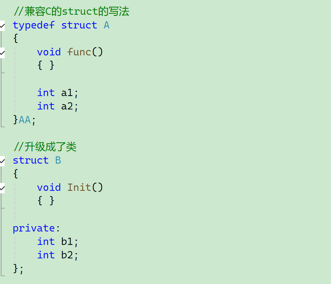 补充: 1、struct其实已经变成类了(当做类使用); 2、类名即类型,用结构体名称就可以指代类型(C不允许,要加struct,要方便只能typedef),因而不用加struct了,但一般我们还是用class,以后基本上99%我们都用class; 3、struct里面可以定义函数(升级成类了); 4、