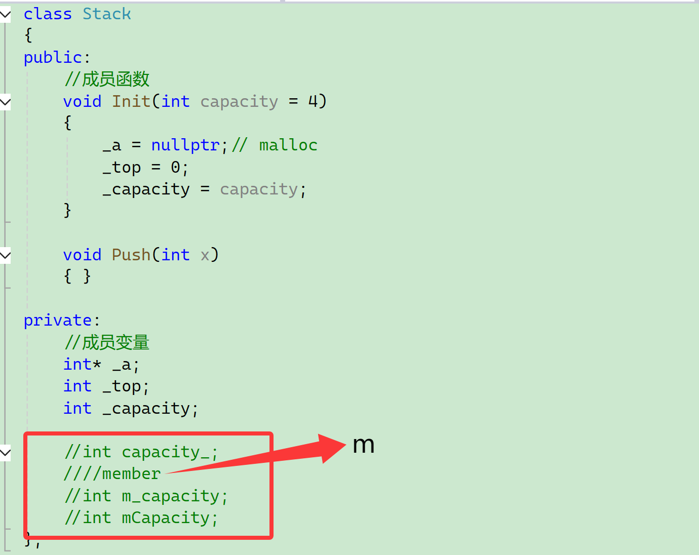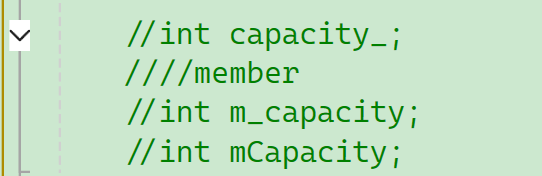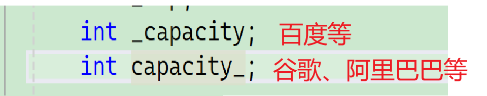 m_ / m + 首字母大写(如mCapacity,再比如m_capacity)。