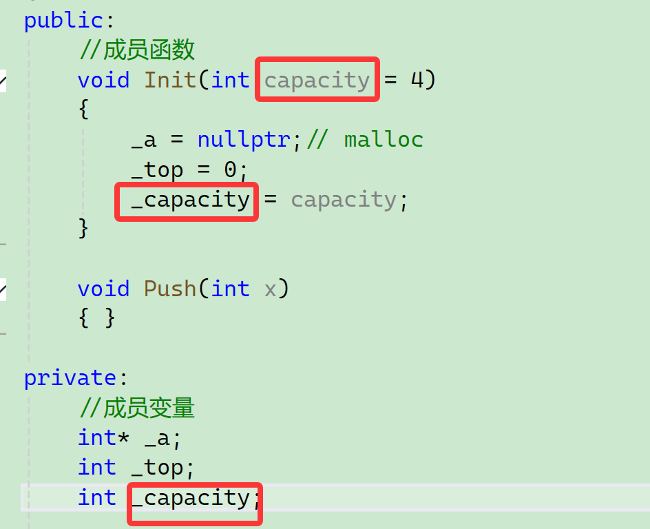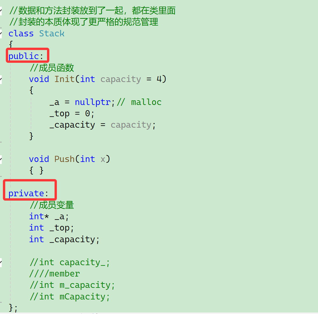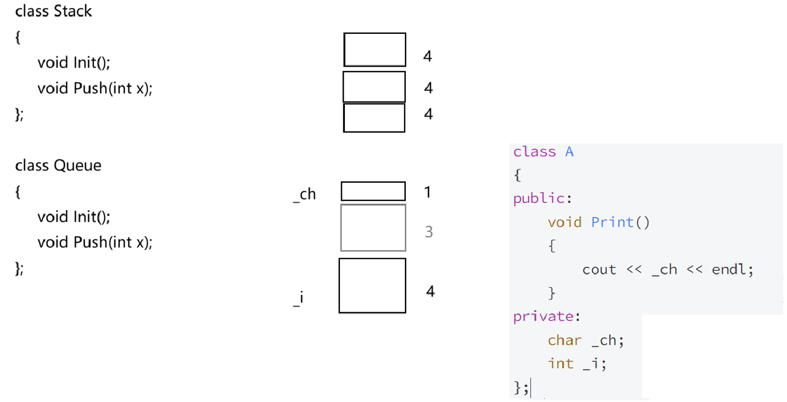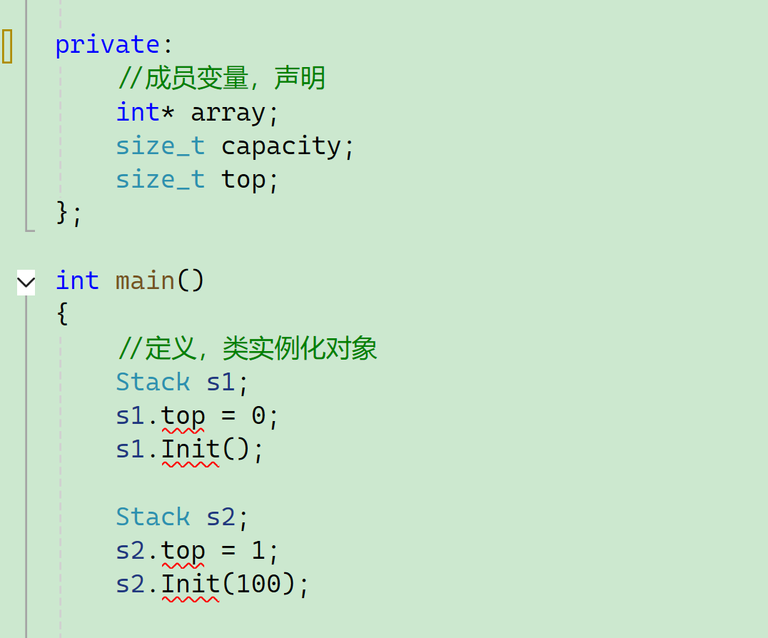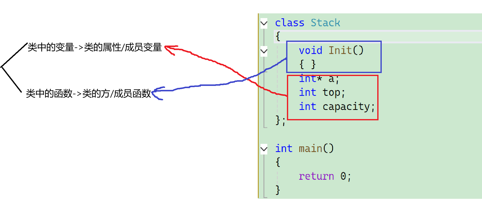 (1)class为定义类的关键字,Stack为类的名字,{}中为类的主体,注意类定义结束时后面分号不能省略。类体中内容称为类的成员:类中的变量称为类的属性或成员变量;类中的函数称为类的方法或者成员函数; (2)为了区分成员变量,一般习惯上成员变量会加一个特殊标识,如成员变量前面或者后面加_或者m开头,注意:C++中没有强制要求在成员变量前面或者后面加_或者m开的,只不过是一些惯例,具体还是得看公司的要求; (3)C++中struct也可以定义类,C++兼容C中struct的用法,同时struct升级成了类,明显的变化是 struct中可以定义函数,一般情况下我们还是推荐用class定义; (4)定义在类面的成员函数默认为inline。