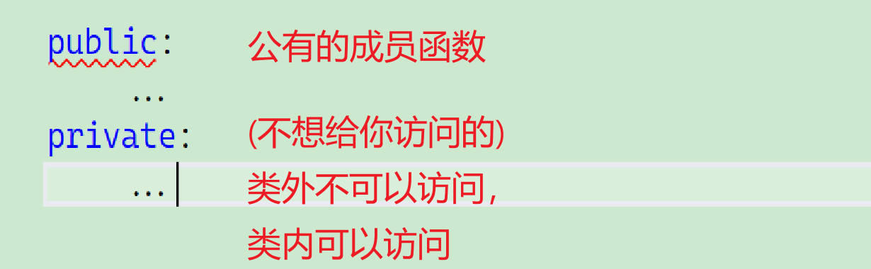 像public、private、protected这样的访问限定符定义几个都行,C++对于这方面没有限制,只不过定义那么多显得有些浪费了,我们直接用一个访问限定符解决,比如如果想类内外都可以访问,那我们把这些成员函数都放到一个public下面,private同理——