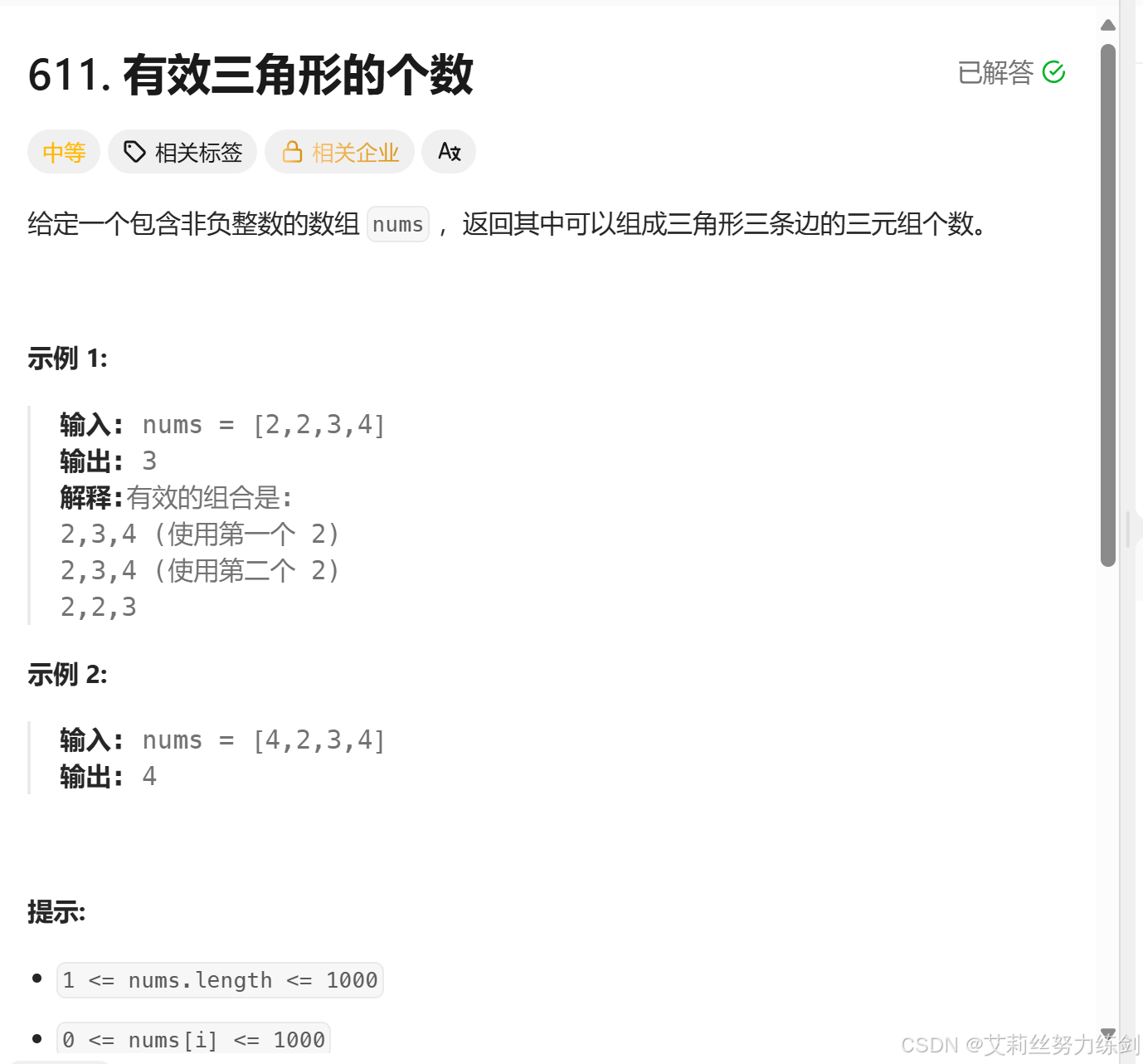 (1)如果能构成三角形,需要满足任意两边之和要大于第三边。但是实际上只需让较小的两条边之和大于第三边即可; (2)因此我们可以先将原数组排序,然后从小到大枚举三元组,一方面省去枚举的数量,另一方面方便判断是否能构成三角形。