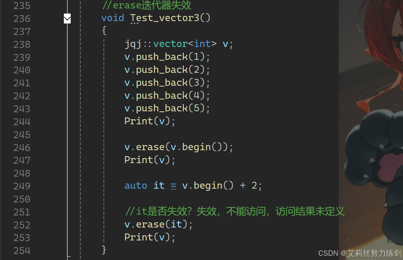 }erase删除pos位置元素后,pos位置之后的元素会往前搬移,没有导致底层空间的改变,理 论上讲迭代器不应该会失效,但是:如果pos刚好是最后一个元素,删完之后pos刚好是end 的位置,而end位置是没有元素的,那么pos就失效了。因此删除vector中任意位置上元素 时,vs就认为该位置迭代器失效了。 以下代码的功能是删除vector中所有的偶数,请问那个代码是正确的,为什么?