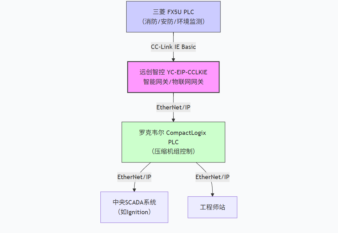 某省级天然气公司长输管道增压站需要进行自动化系统升级。站内核心的压缩机组控制系统采用罗克韦尔(Allen-Bradley)CompactLogix系列PLC,其上层网络构架为行业通用的EtherNet/IP。而负责站内消防、安防以及环境监测的辅助系统,则选用了性价比优异的三菱FX5U系列PLC,其内置的网络协议为三菱主流的CC-LinkIEBasic。