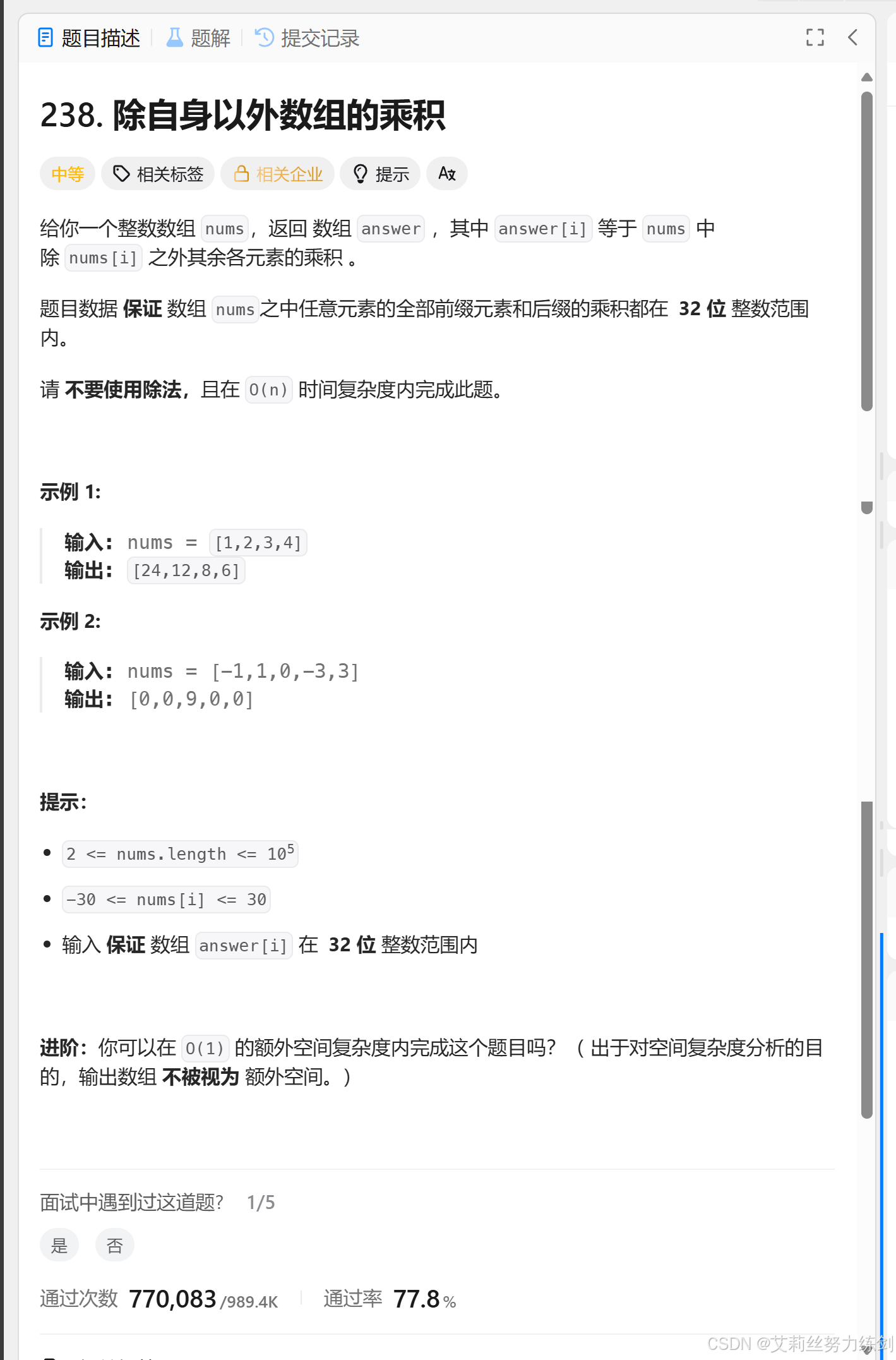 使用前缀和后缀乘积在O(n)时间内计算数组中每个元素除自身外所有元素乘积的算法问题。