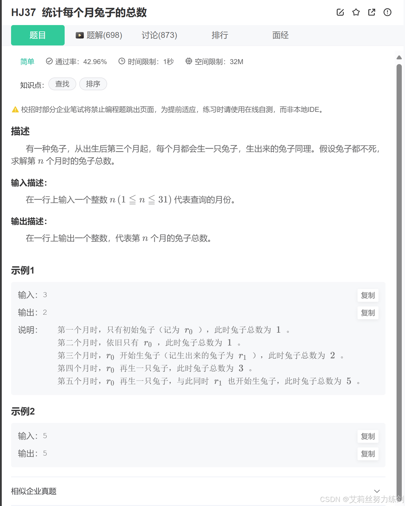 这道题的关键在于寻找数字之间的规律,如果细心的友友会发现这其实是一个斐波那契数列。规律:第 n 个月的兔子数量实际上就是第 n - 1 个斐波那契数。