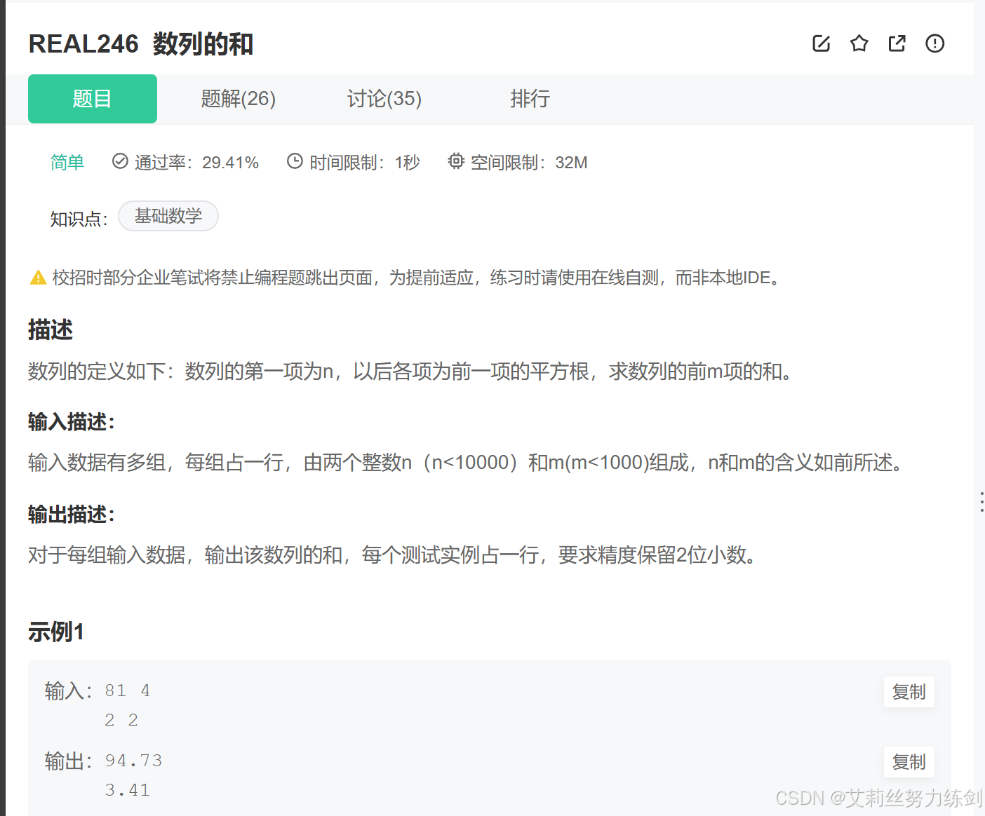 (1)第一项为n,之后每一项是前一项的平方根; (2)循环m次,每次将当前项加到总和,并更新当前项为它的平方根; (3)注意精度:使用double类型,输出保留两位小数。