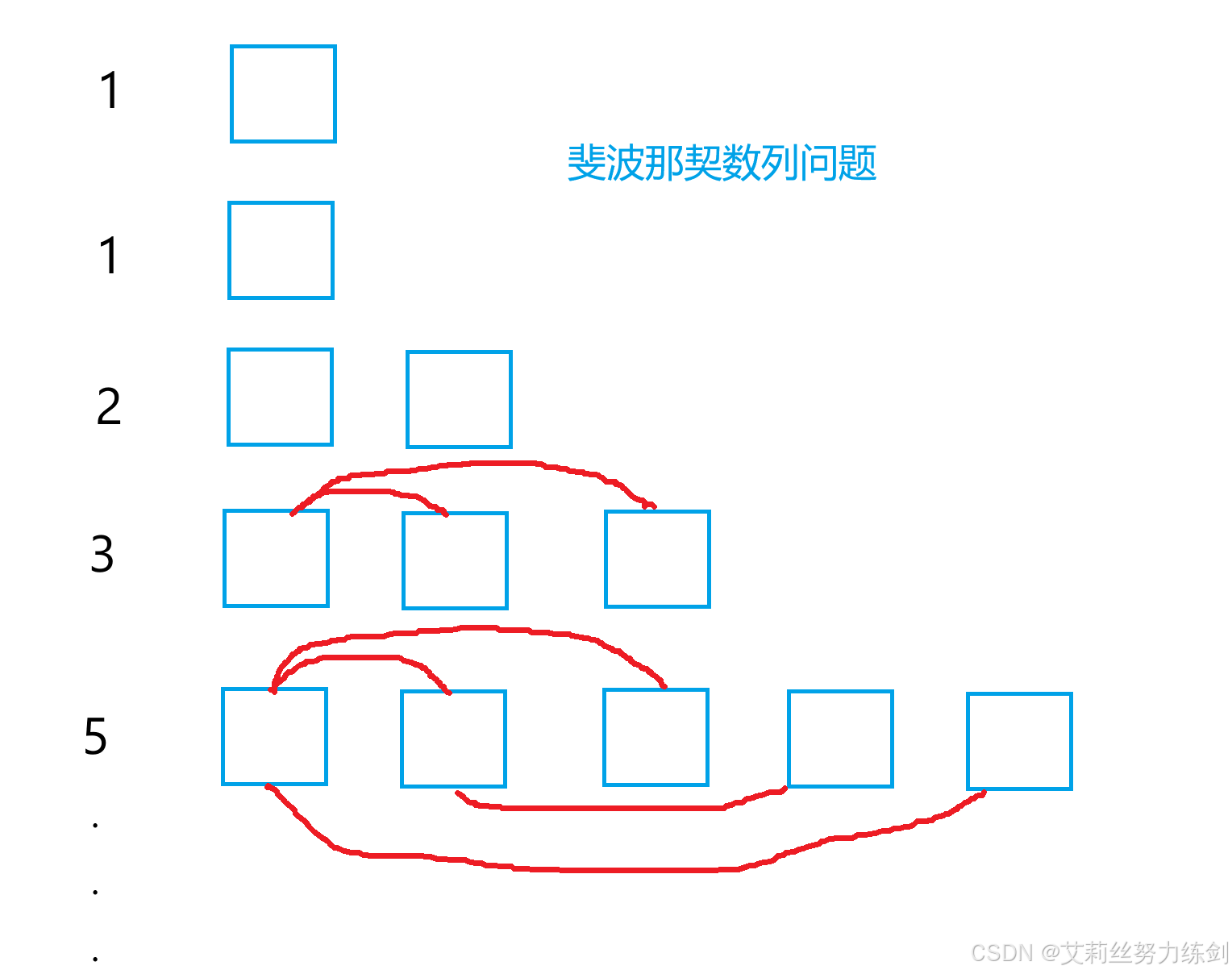 题意理解——计算斐波那契数列的第n项(从第1项开始:1,1,2,3,5,...),因为兔子生长规律与斐波那契数列相同。如下图所示,博主这里画了一个简单的示意图——