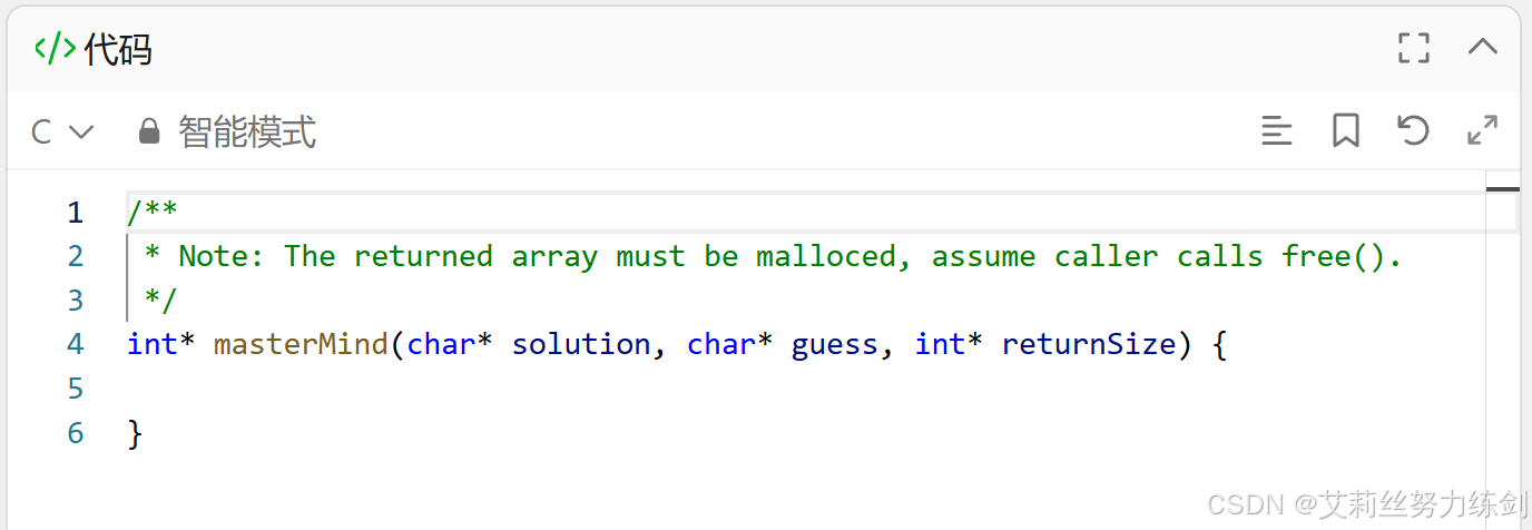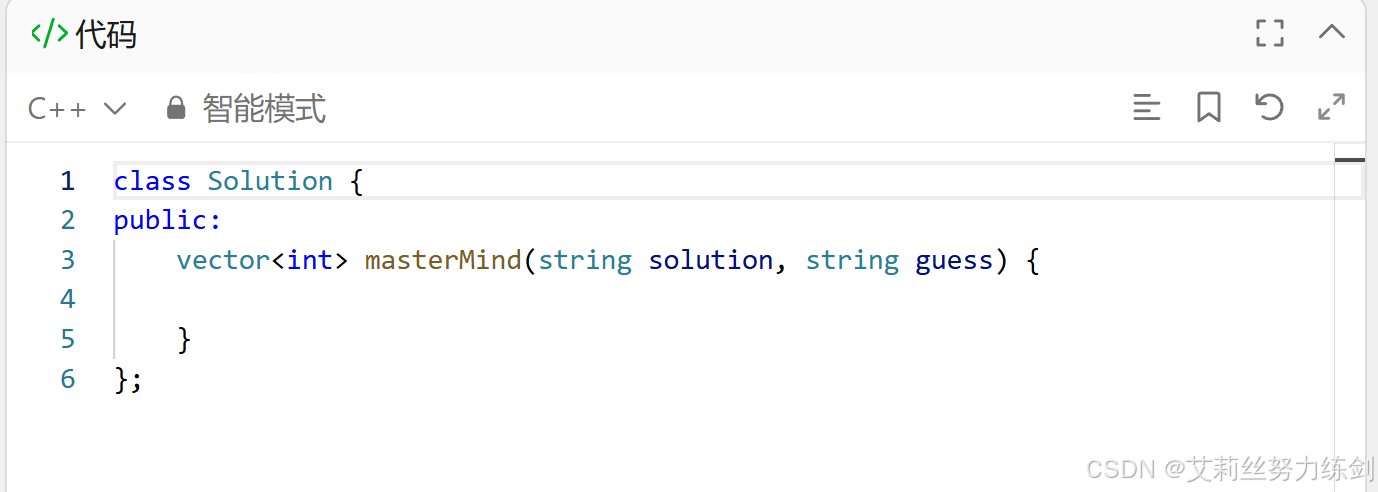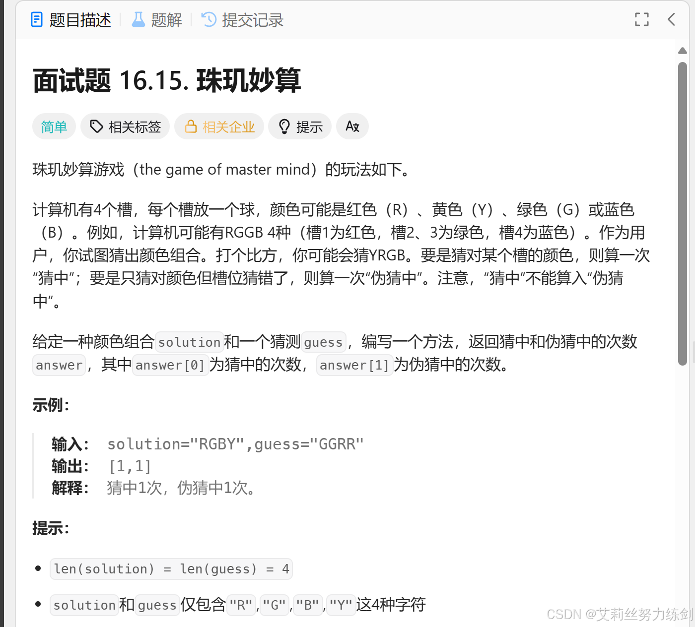 solution和guess的字符到频率数组(或计数数组)。 (3)第二次遍历:对于每种颜色,计算伪猜中次数 = min(该颜色在solution非猜中位置的出现次数, 该颜色在guess非猜中位置的出现次数)。