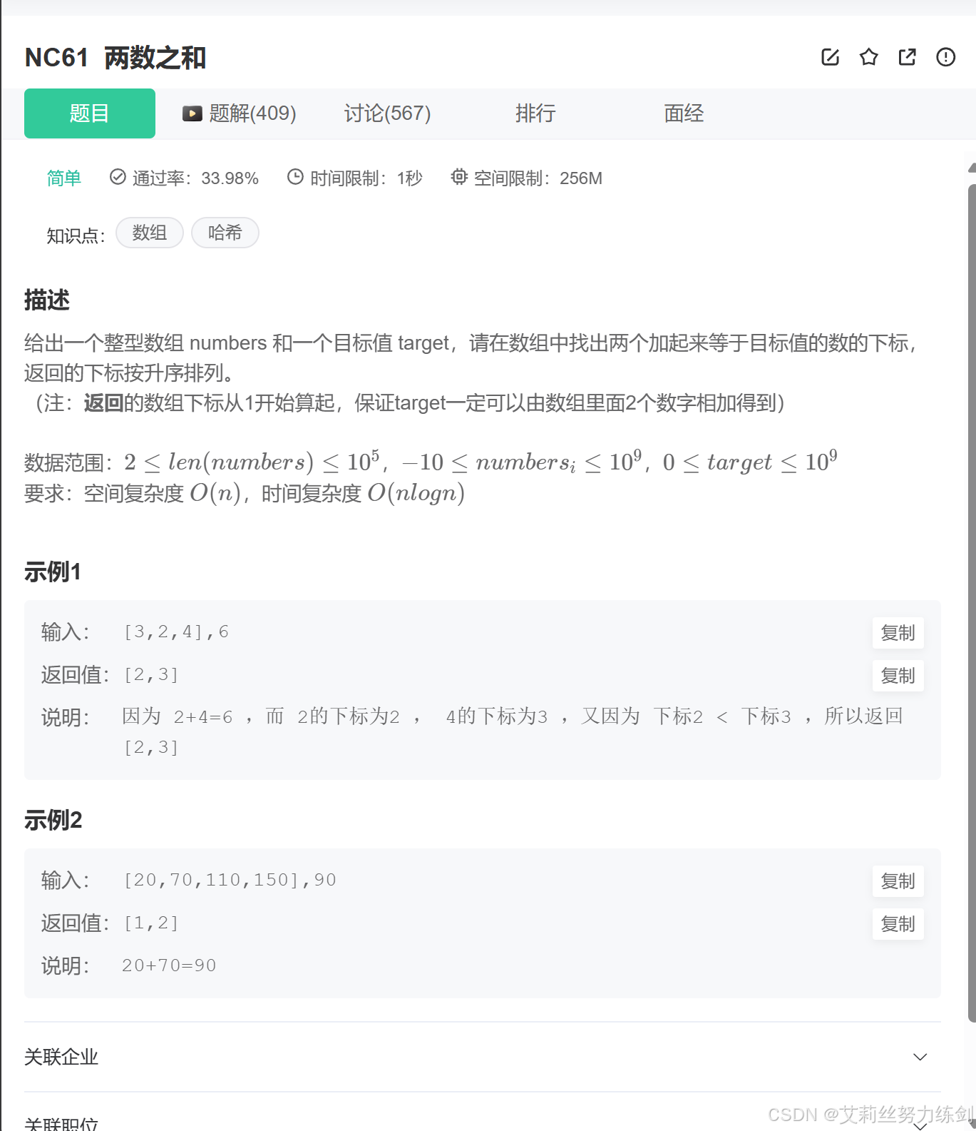 (1)C语言实现:排序需要 O(nlogn)O(nlogn),双指针遍历需要 O(n)O(n),因此总时间复杂度为 O(nlogn)O(nlogn),满足要求。 (2)C++实现:使用哈希表,每个元素插入和查找的平均时间复杂度为 O(1)O(1),因此总时间复杂度为 O(n)O(n),优于要求(O(nlogn)O(nlogn))。