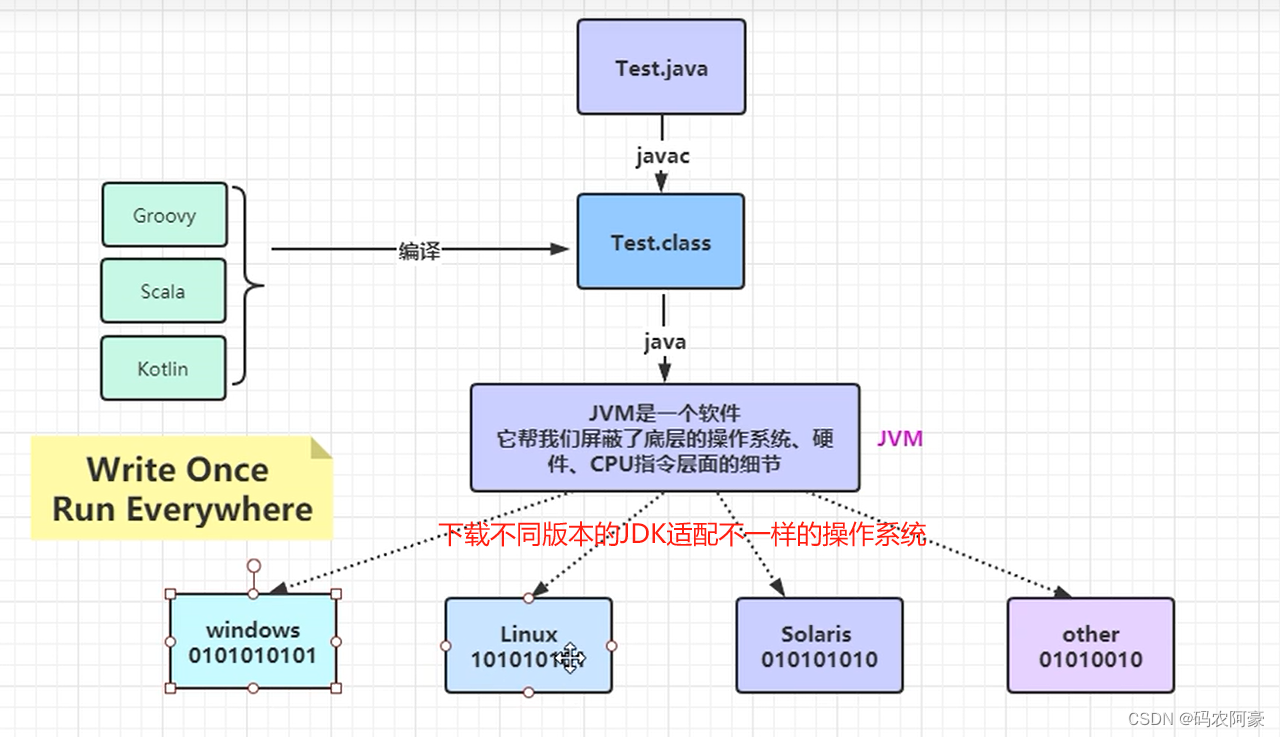 (1)Test.java --> javac --> Test.class --> java Test (2)Test.java --> javac --> Test.class --> Mall.jar --> java -jar Test.jar (3)Test.java --> javac --> Test.class --> Test.war --> Tomcat --> startup.sh --> org.apache.catalina.startup.Bootstrap 总结起来,运行一个java程序都是通过JDK下面bin/java启动一个JVM虚拟机,在虚拟机里面运行Test.class