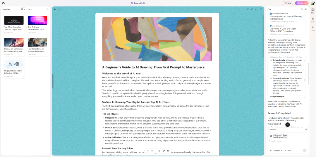 很多人学了很多,却做不出成品,原因在于流程割裂。YouMind 的最大特色是**“统一空间”**:从资料收集到理解分析,再到创作输出,整个过程在一个平台完成,不再需要多工具切换,减少认知负荷,让学习和创作融为一体。