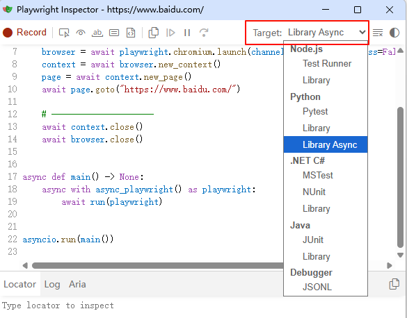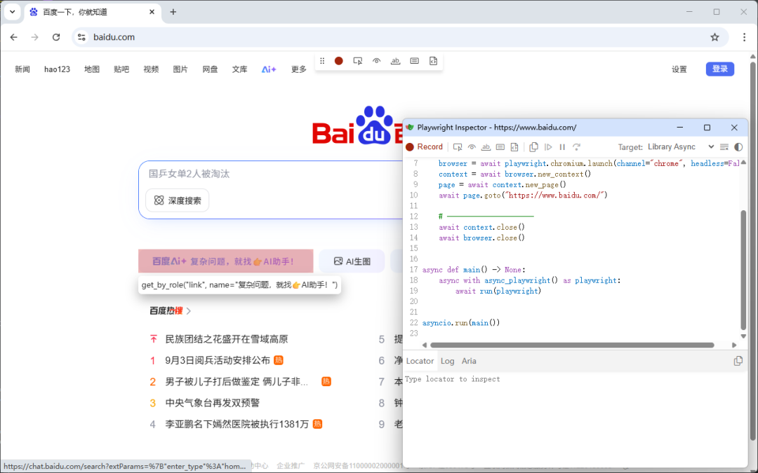 asyncio.run(main())测试生成器 Test generatorPlaywright 自带一个 codegen 命令,运行 codegen 命令时,将打开两个窗口:一个是浏览器窗口,用于与要测试的网站进行交互;另一个是 Playwright 检查器窗口,用于记录测试结果,然后可以复制代码到编辑器中。这种方式对我们定位元素,执行操作,帮助极大。