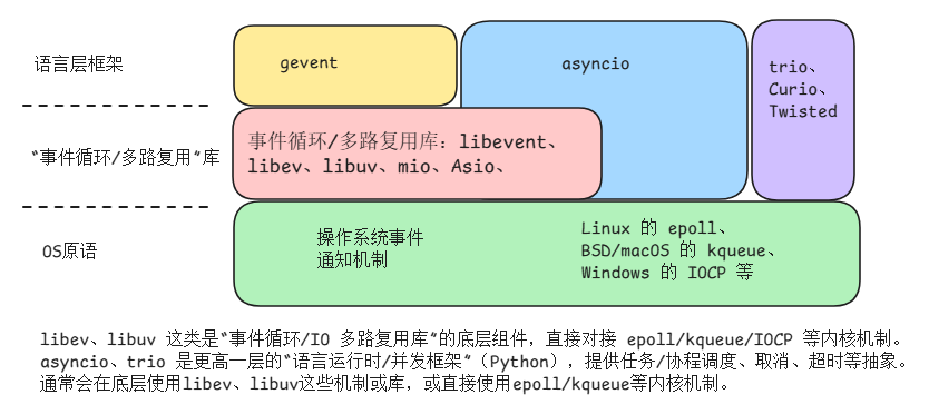 关于事件循环,这里有一个概念关系图,它们都是基于操作系统底层的事件通知机制: