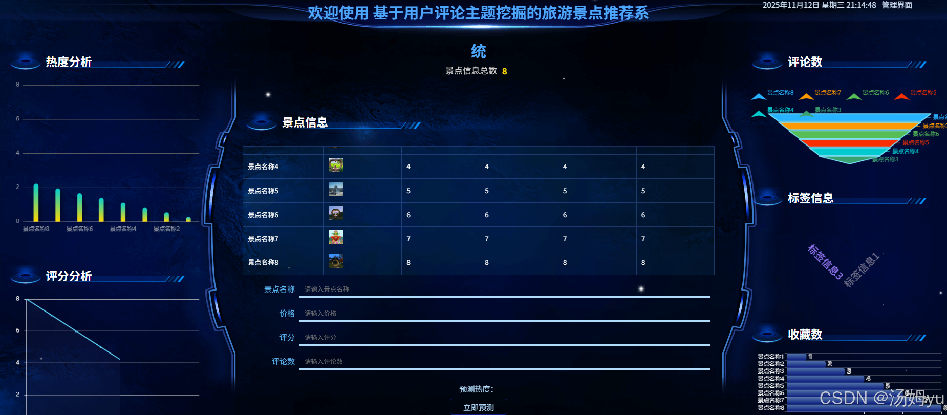 在旅游业数字化转型与个性化服务需求激增的当下,基于用户评论分析挖掘的旅游景点推荐系统研究正蓬勃发展。当前,技术融合不断深化,传统依赖评分或简单标签的推荐模式已逐渐被摒弃,研究者通过自然语言处理技术,结合LDA主题模型、BERTopic等深度学习模型,深入挖掘非结构化评论中的隐性主题与情感倾向,构建“景点 - 主题 - 用户偏好”关联图谱,量化游客对景点各维度的偏好强度。应用场景也持续拓展,为满足游客日益显著的个性化需求,系统整合用户历史行为数据,结合协同过滤算法实现混合推荐,如针对带娃家庭推荐“亲子友好 + 低消费”景点,为摄影爱好者筛选“日出拍摄点”等主题景点。在产业实践方面,在线旅游平台积累的海量评论数据为系统训练提供资源,研究者引入实时评论流和动态主题建模,提升推荐系统的实时性与可解释性,不仅可实时调整推荐结果,还能通过可视化展示推荐依据增强用户信任度,同时为景区提供评论反馈的主题聚类分析,助力其优化服务。