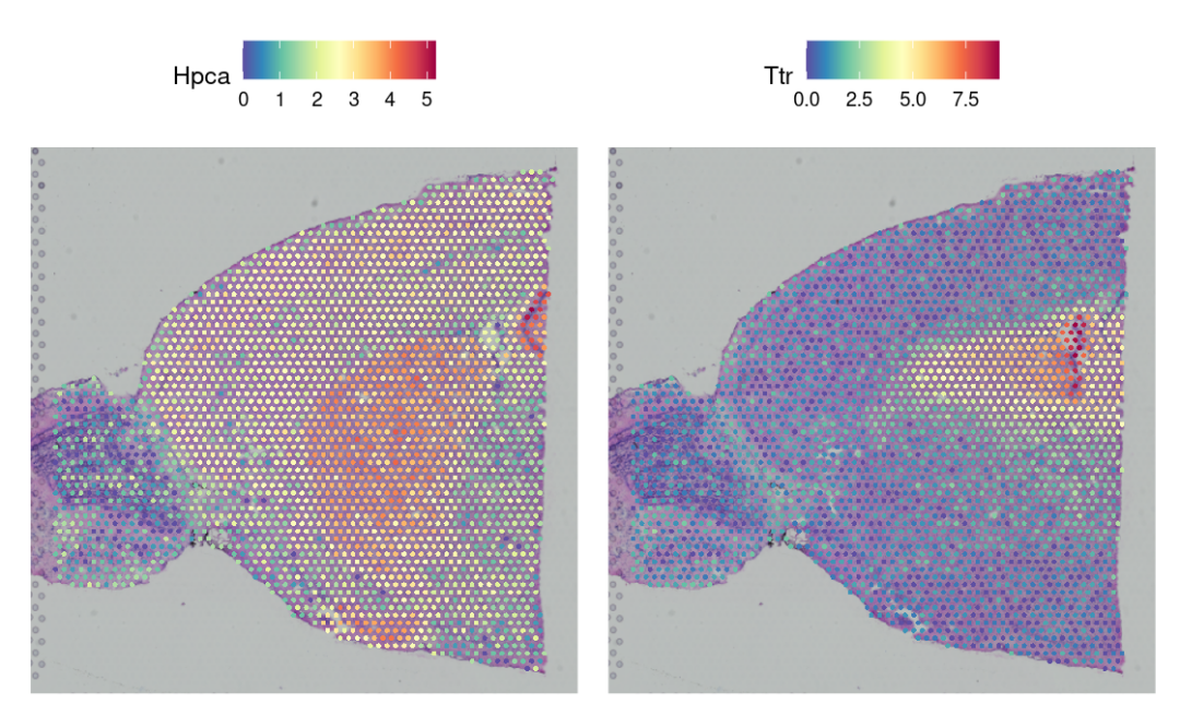 在这个小鼠大脑的数据集中,基因Hpca是强海马体marker,Ttr是脉络丛的marker。😁