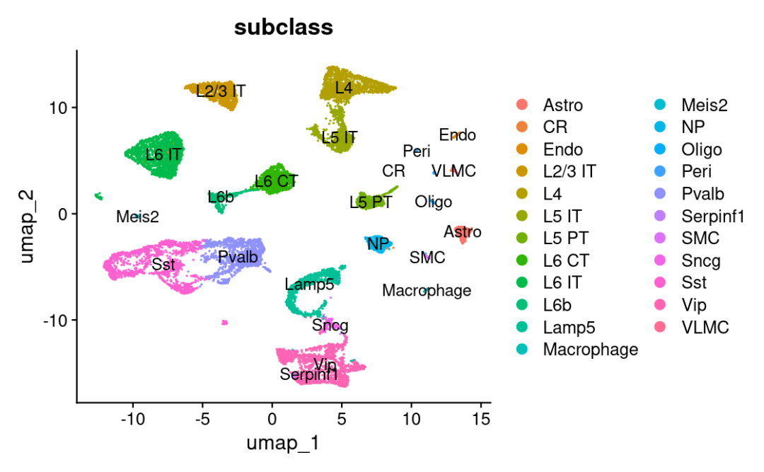 DimPlot(allen_reference, group.by = "subclass", label = TRUE)