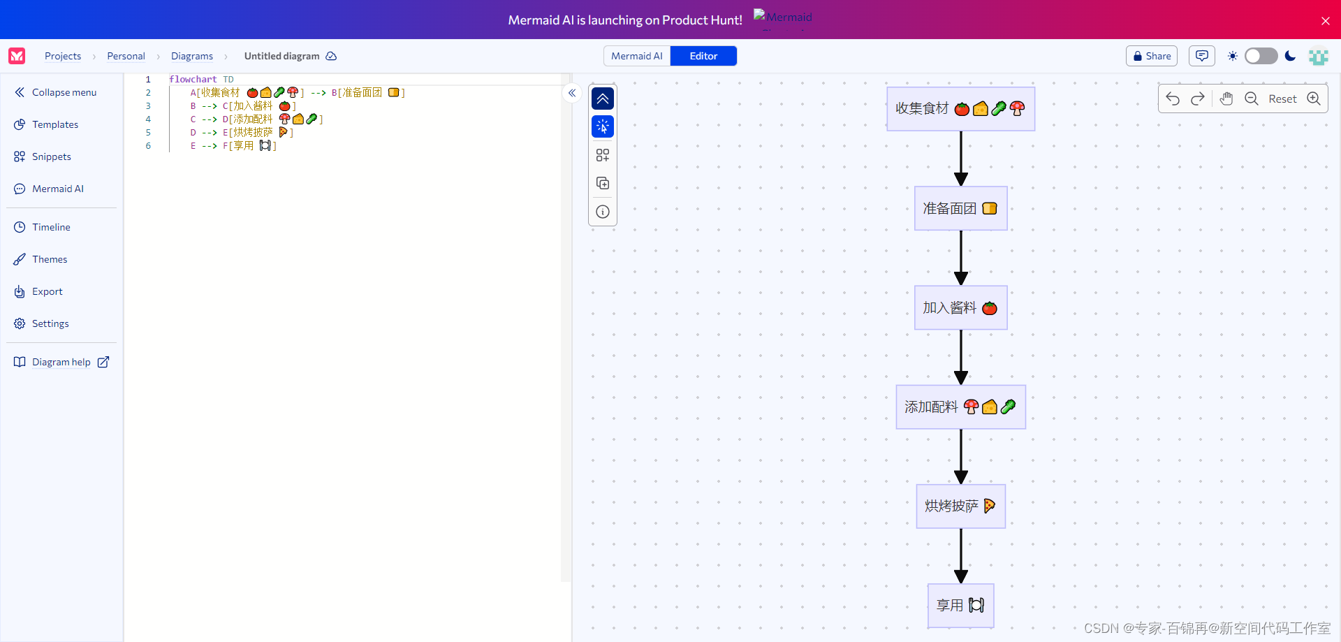 我们来创建一个制作披萨的流程图,并添加表情符号以增加视觉效果。流程图将包含以下步骤: