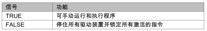 该输出端由机器人控制系统来设定,以向上级控制器显示出现了一条要求停住机器人的信息提示。(例如:紧急停止按键、运行开通或操作人员防护装置)