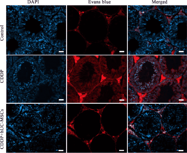 Evans blue permeability assay for BTB integrity. Blue fluorescence indicates DAPI-stained nuclei, while red fluorescence corresponds to Evans blue staining