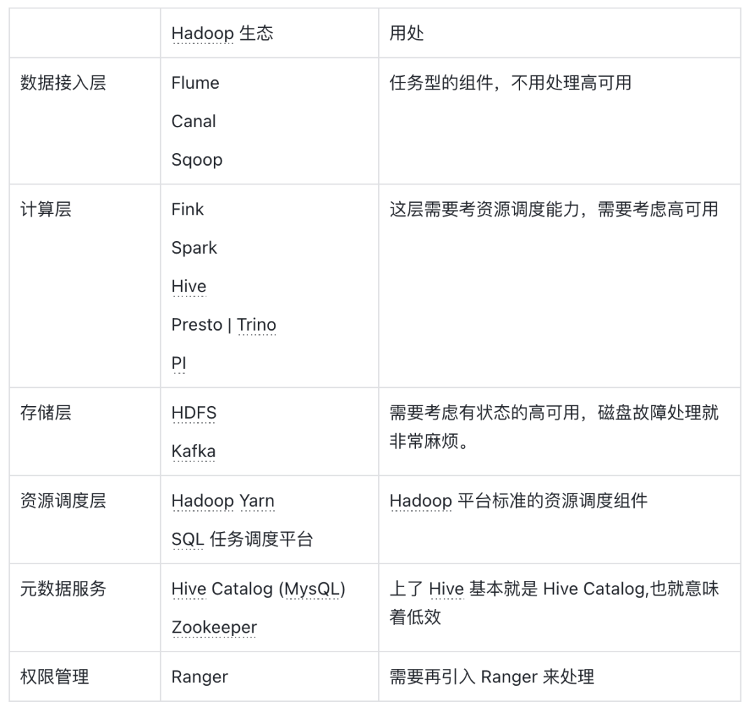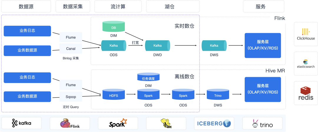 此外,同一份数据被多个路径消费,存在数据冗余,且缺少统一的权限管理服务。涉及的技术栈包括 Flume、Canal、Sqoop、Flink、Hive、Presto/Trino、HDFS、Kafka、Hadoop Yarn、Hive Catalog 等,运维复杂度极高。从业务上讲两套平台很多数据指标经常对不齐,也给使用带来困扰。