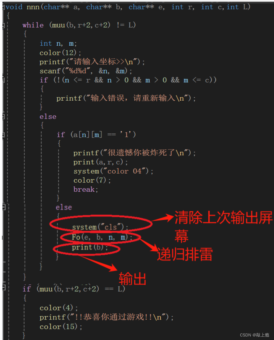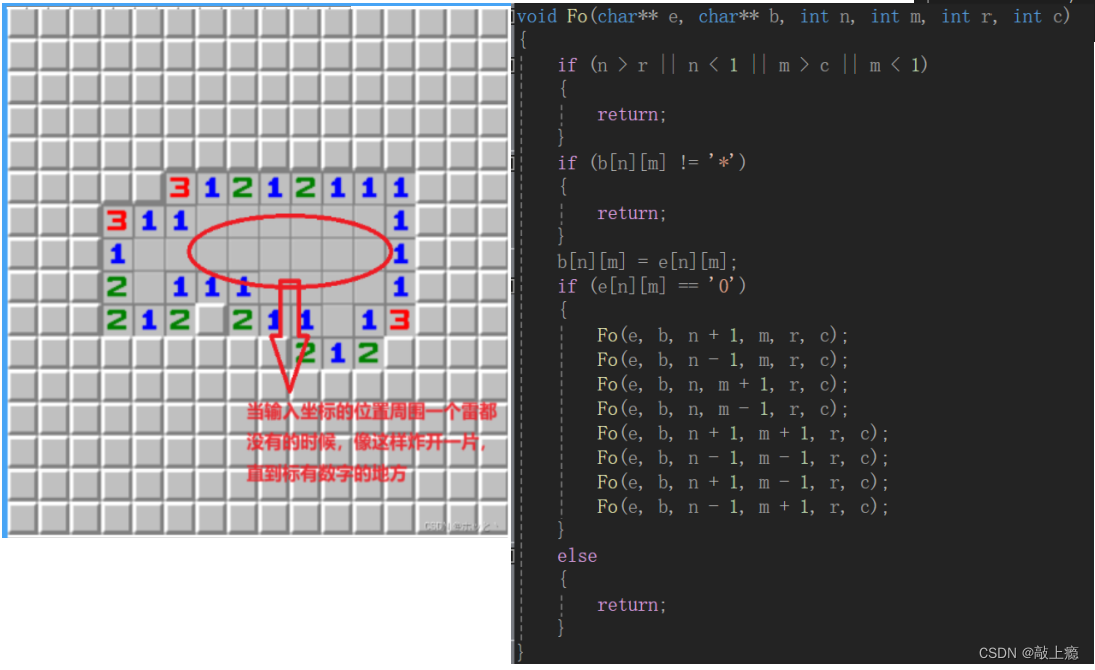 玩家输入坐标后用数组a[rs][cs]判断是否为雷(即是否是 ' 1 ')如果是则游戏失败并显示给玩家雷区信息(及棋盘a[rs][cs])。如果不是则把e[rs][cs] (即周围一圈雷的个数)赋值给对应位置的数组b[rs][cs],该过程通过Fo函数递归实现,即下面第3点递归扫雷,最后把数组b[rs][cs]呈现(输出函数实现)给玩家。
