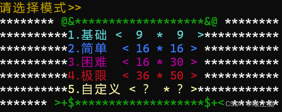 printf("**********"); color(13); printf("3.困难 < 16 * 30 > "); color(15); printf("***********\n"); Sleep(100);