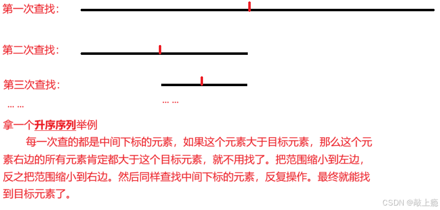 这种方法是通过将目标元素和查找范围的中间值做比较(如果目标元素=中间值,查找结束),通过做比较将目标元素分到较大/或者较小的一组。从而将查找范围缩小一半。重复多次,直到目标元素=新的范围的中间值,查找结束。