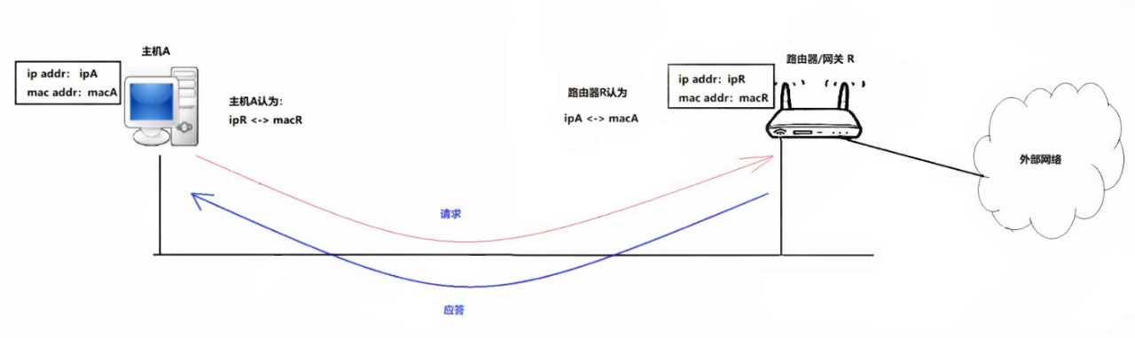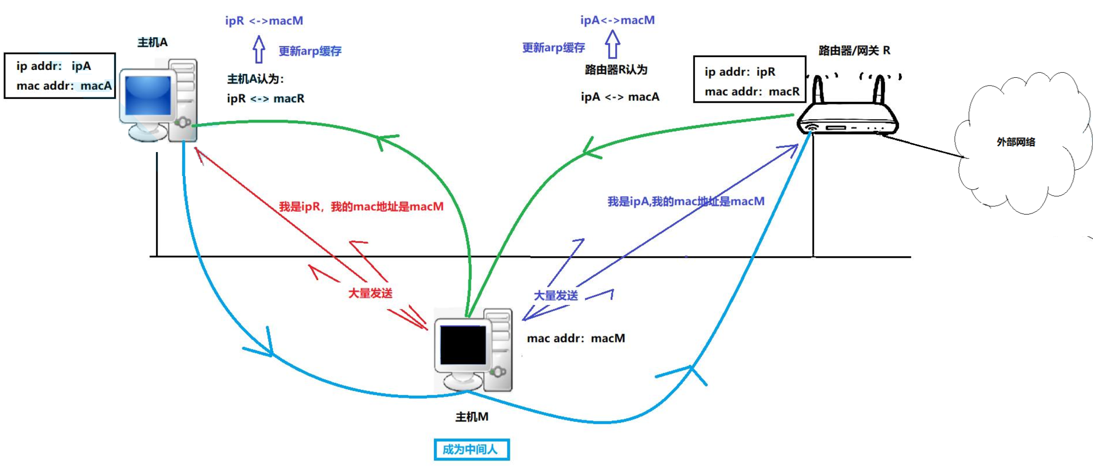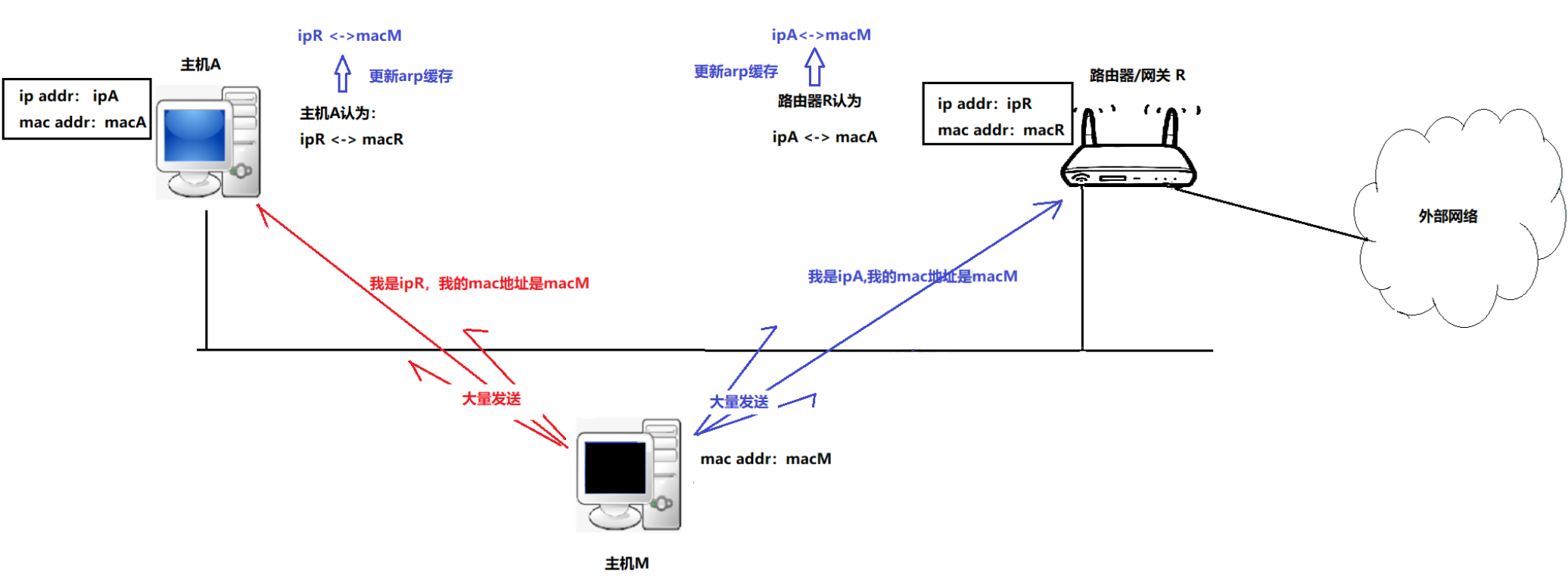 以 A 主机为例,如果有一个中间人(黑客)冒充路由器(伪造路由器 IP)向主机 A 发送 ARP 响应,填充的是中间人自己的 MAC 地址。那么主机 A 发送的报文就会都到达中间人手上,中间人可以把它们丢弃,导致主机 A 上不了网;或者进行篡改后再交给路由器通向互联网。