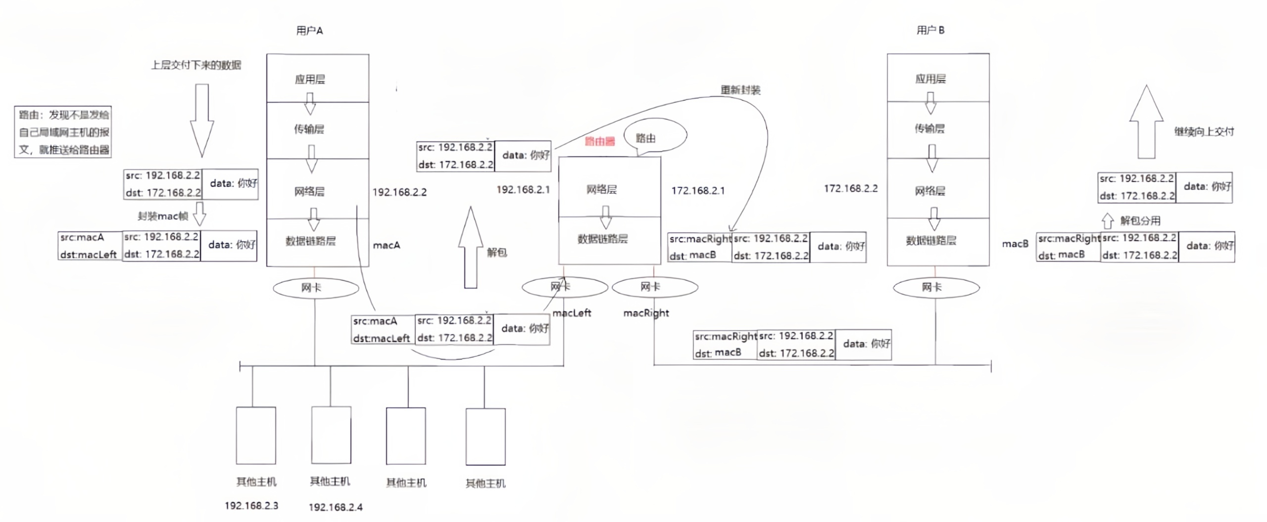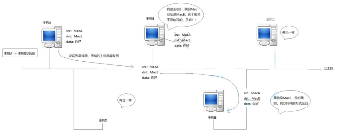 在局域网内,主机之间的通信处于数据链路层。例如,主机 A 给主机 E 发数据,这个过程所有主机都能接收到(这种现象叫泛洪),但只有目标 MAC 值与自身匹配的主机才会接收数据,其他主机就像“吃瓜群众”。若一个主机接收并非发给自己的数据,这个过程就叫抓包。