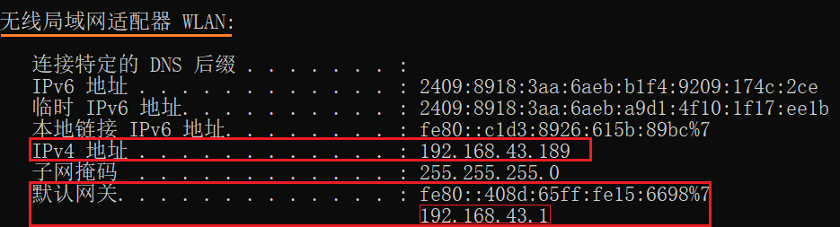 如果是连接WiFi则查无线局域网适配器WLAN,如果是连线上网查以太网适配器,如下: