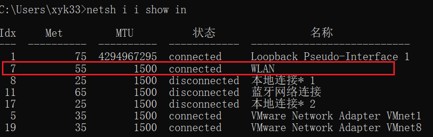 netsh i i show in 指令查看对应 WLAN 的索引,示例如下: