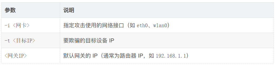 arpspoof是 ARP 欺骗攻击工具(属于 dsniff 工具包),用于在局域网(LAN)中发起中间人攻击(MITM),通过伪造 ARP 响应包欺骗目标设备,使其网络流量经过攻击者的机器。