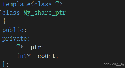 这里就以shared_ptr为例,其他都是一样的,首先shared_ptr本质就是一个类模板,需要我们传入模板参数,比如我们需要让它管理一个int类型的指针。那么它的类型就是: