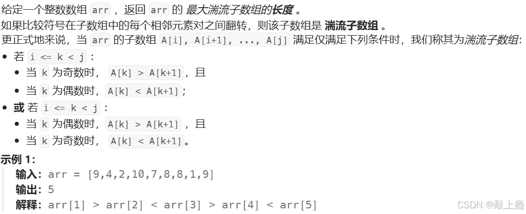 也就是子数组要满足前一个元素是上升趋势那么下一个元素必须是下降,如果前一个元素是下降趋势那么下一个元素必须是上升。