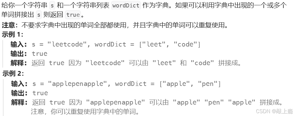 因为在填写i时以前的每个子串是否能由字典表示已经知道,储存在dp表中。那么我们只需要找到任意一个j(0<=j<i)使得dp[j]=true,并且子字符串[j+1,i]能用字典表示,那么dp[i]=true,否则dp[i]=false。