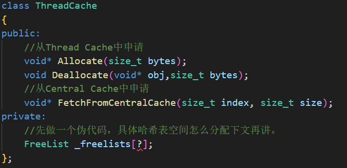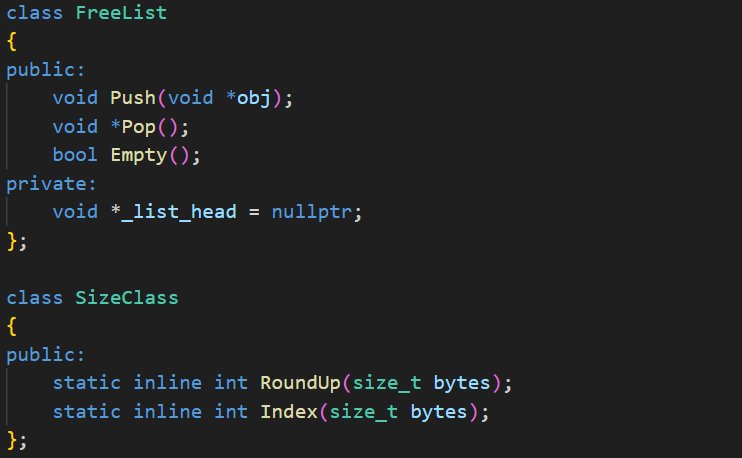 封装一个类,它的成员变量应包括:一个size_t类型储存该块空间的字节大小,一个void*指针储存自由链表的头,char*指针指向这块空间的起始地址,char*类型指针每加1只向后移动一字节,方便指针的移动。因为我们每被用户申请一小块空间后,指针往后移动到下一个为没利用的空间的起始地址。