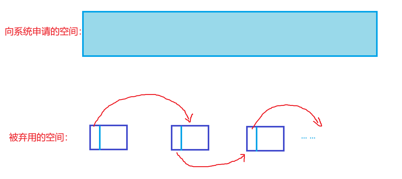 如上所述,我们先向系统申请一大块空间,然后当我们需要申请内存时就从这块空间上获取,我们把空间用完后不用急着释放回系统,而是把它用一个自由链表连接起来,进行二次利用。也就是说我们再次申请空间时可以在这块废弃的空间上找,如果没有再去大空间上找,如果还不够再去向系统申请。