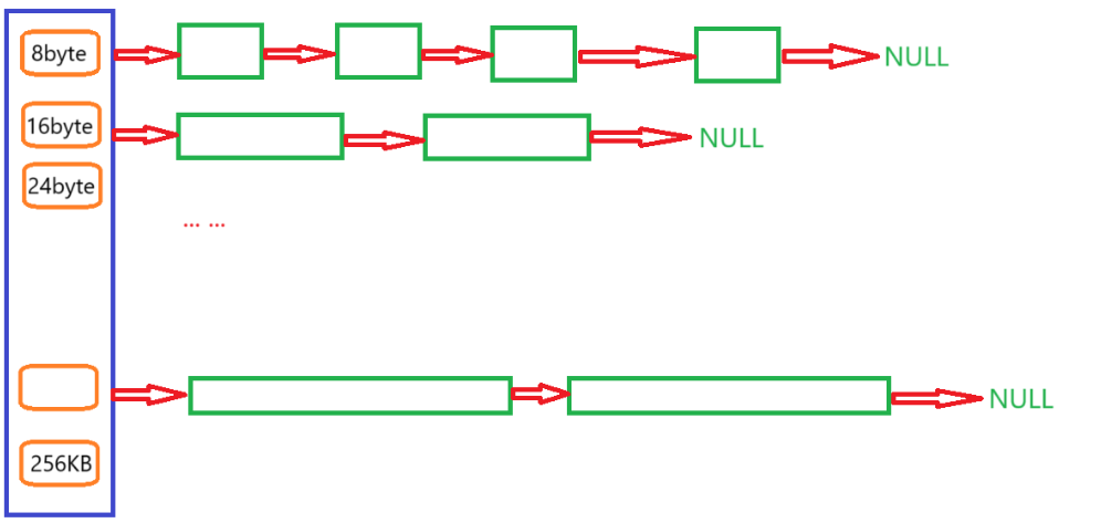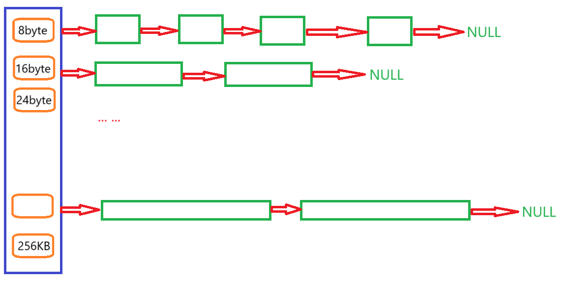 如果链表里没有空间向大空间里获取,但这个块大空间是需要向系统申请的,不是一开始就存在。
