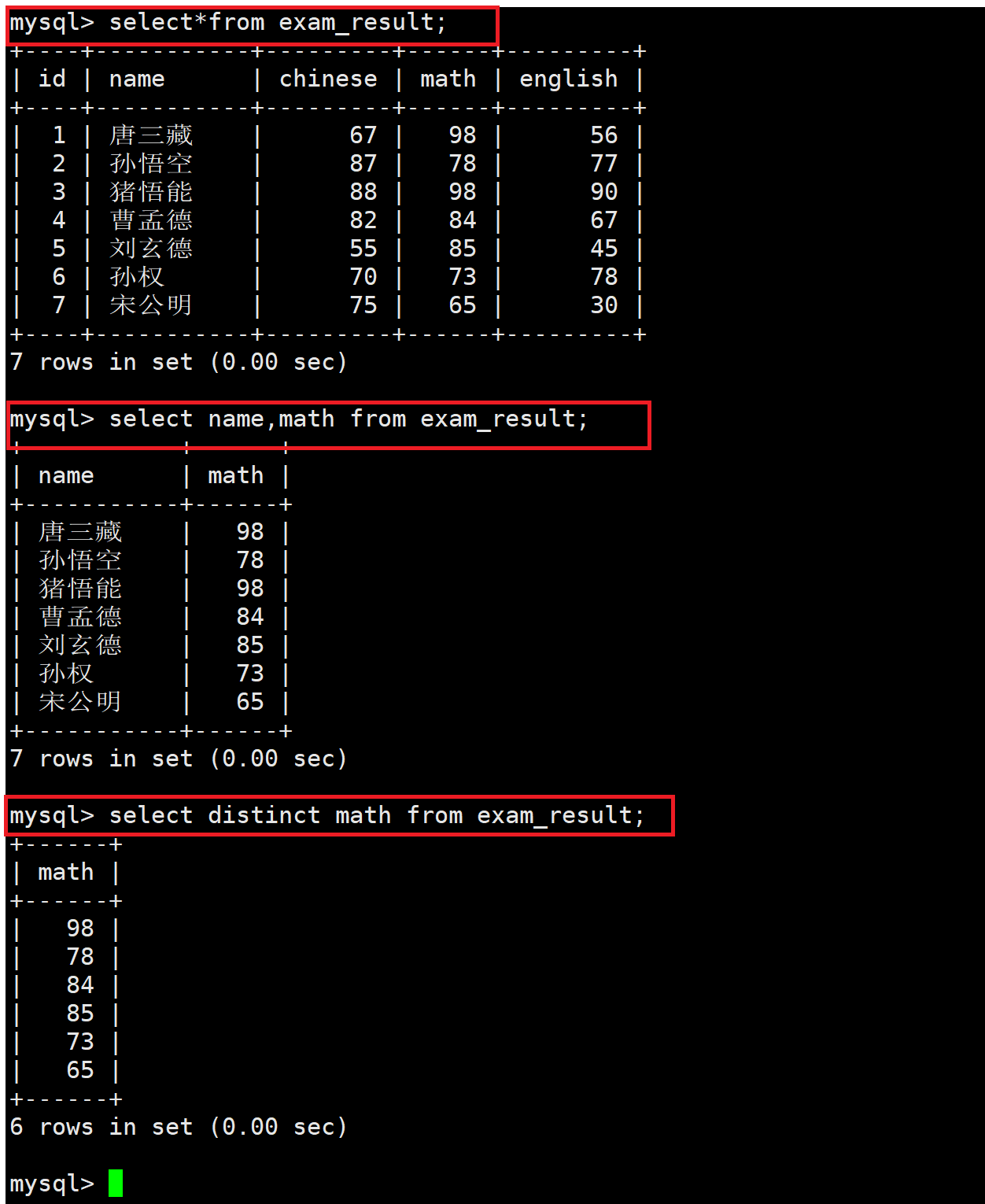 mysql> select name,chinese from exam_result where chinese between 80 and 90;数学成绩是58或59或98或99分的同学及数学成绩