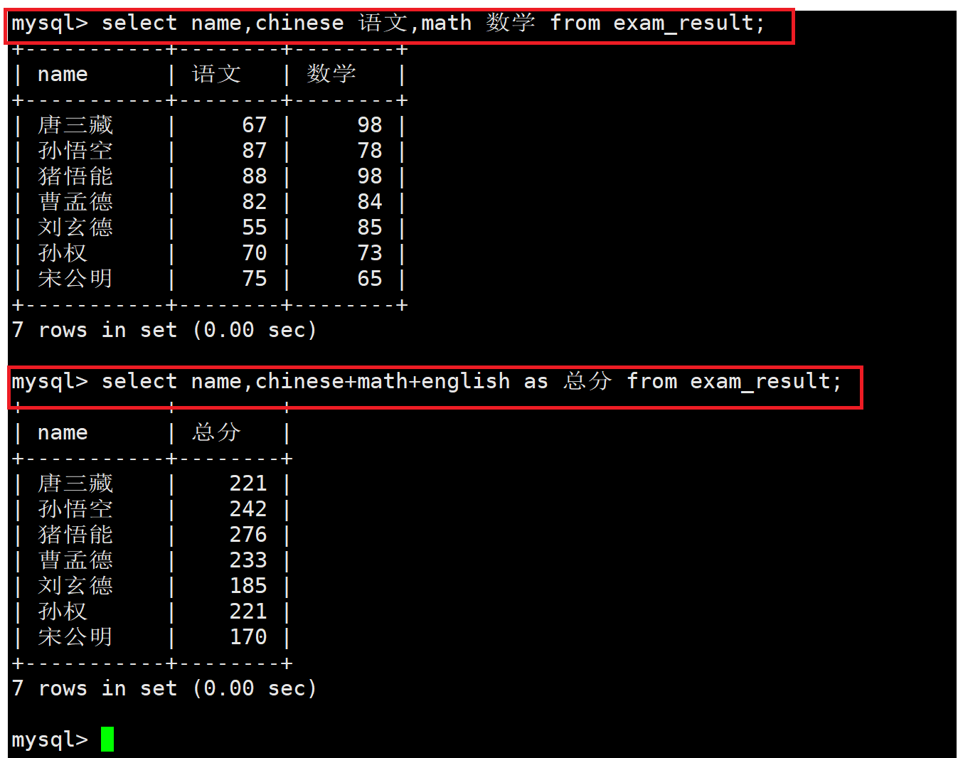 mysql> select name,chinese,math,english,chinese+math+english 总分