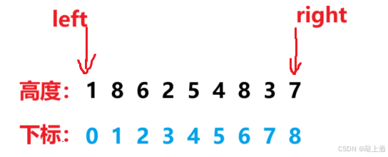 通过以上发现的性质我们就可以设计算法了,首先用left指针指向0下标,right指针指向最后一个元素的下标,然后计算并更新最大容量。如果left指向元素较小那么left右移,如果right指向元素较小那么right左移,然后计算并更新最大容量。循环进行直到left与right相遇,最后返回最大容量。