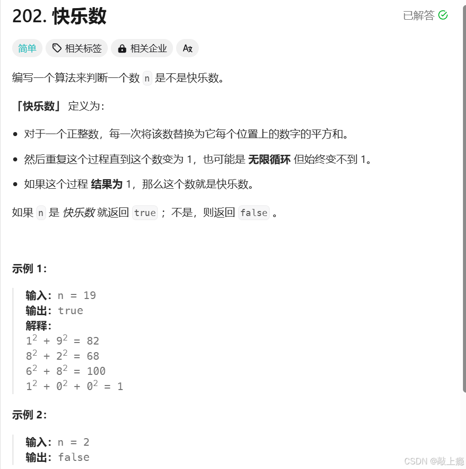 该题目的意思是给定一个数然后把它的各个位数平方相加生成一个新的数,然后再次对这个新的数的各个位数的平方相加生成新的数,循环往复操作直到这个数变成1返回true或者根本变不到1返回false。如上19,它的个位数的平方加十位数的平方得到新的数82,继续对82进行同样的操作直到能够判断它是否能变为1。