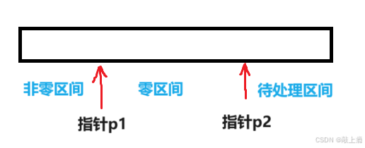 这里可以让p1指向非零区间的最后一个元素,p2指向待处理区间的第一个元素,这样的话如果p2遍历到非零元素的话就可以直接与++p1后交换元素。而如果p2遍历到零元素的话并不需要做任何改动,p2继续遍历。那么随着p2遍历结束整数组就只剩下非零区间和零区间,而且非零元素的相对顺序依旧不变。这样这个算法就算完成了。