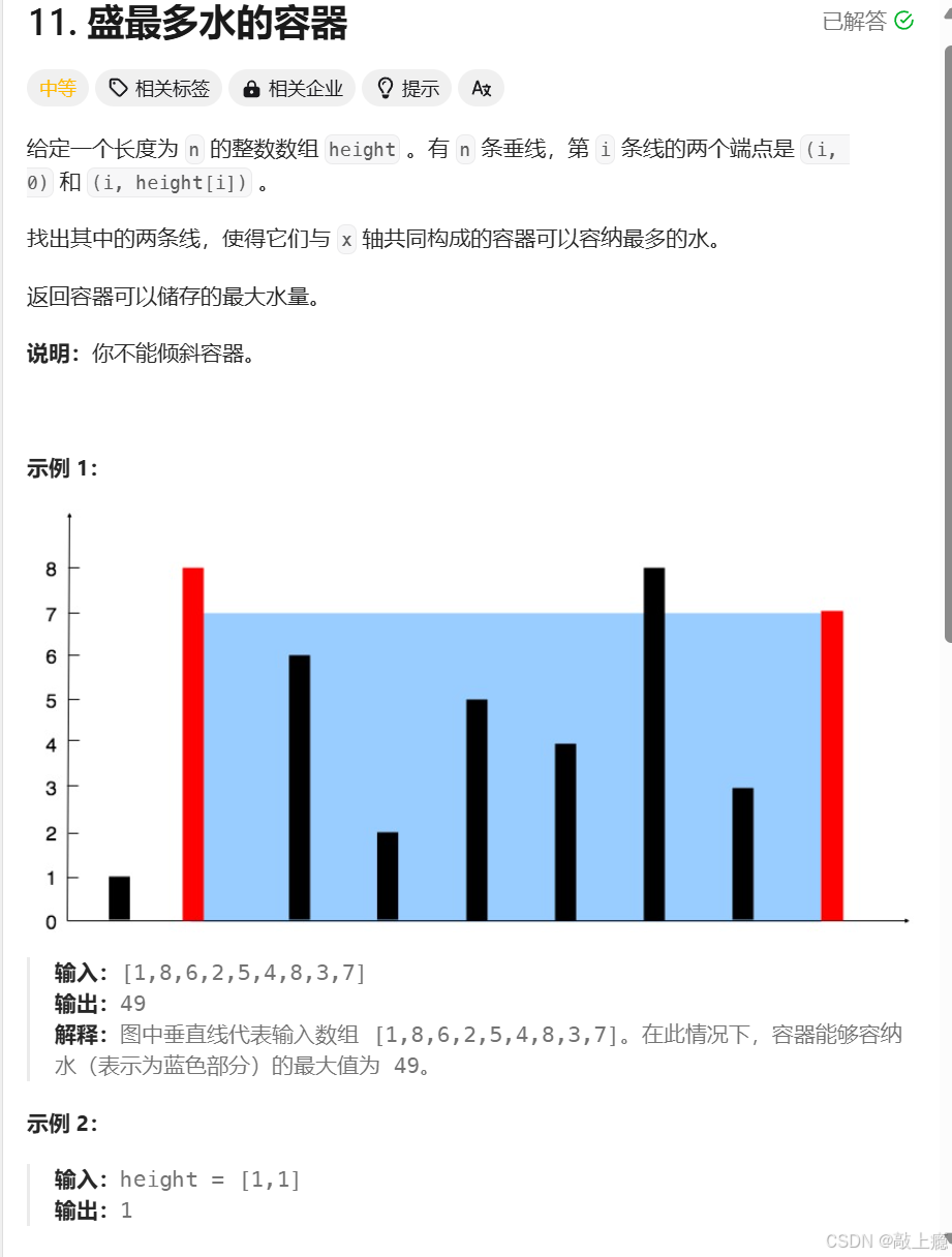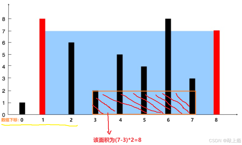 该题目的意思是给一个数组,数组的下标代表柱子的横坐标,下标对应的元素代表着高度,选择两个柱子,两坐标相差的值作为容器长度,而选纵坐标最小的作为容器高度。然后构成一个容器,宽乘以高表示容器的储水量,如下:下标3和7的柱子的储水量。