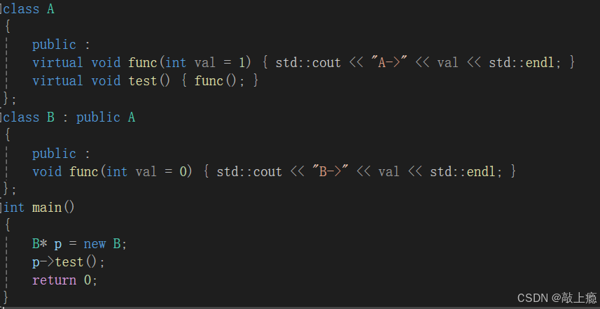 这里虽然B类的func成员没有写virtual关键字,但它是由A继承下来的依旧保留virtual的性质,然后因为重写并为要求参数的缺省值相同,所以这里构成函数的重写。再来看主函数main,p调用了test,而test是A的成员函数隐含了一个const A* (this指针)的参数类型,p传到test函数满足多态,所以这里调用的是B的func。但是这里有个坑,该题的输出结果并不是“B->0”,而是“B->1”。