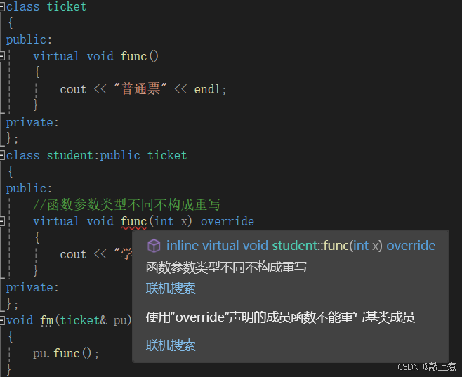 这里如果虚函数的重写没有加virtual,但是父类加了virtual那么子类依旧保持virtual的性质,也可构成重写。