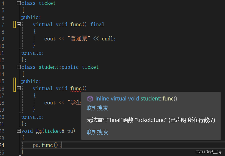 final关键字:如果不想子类对该虚函数进行重写的话就可以使用final关键字,放在函数名后面。